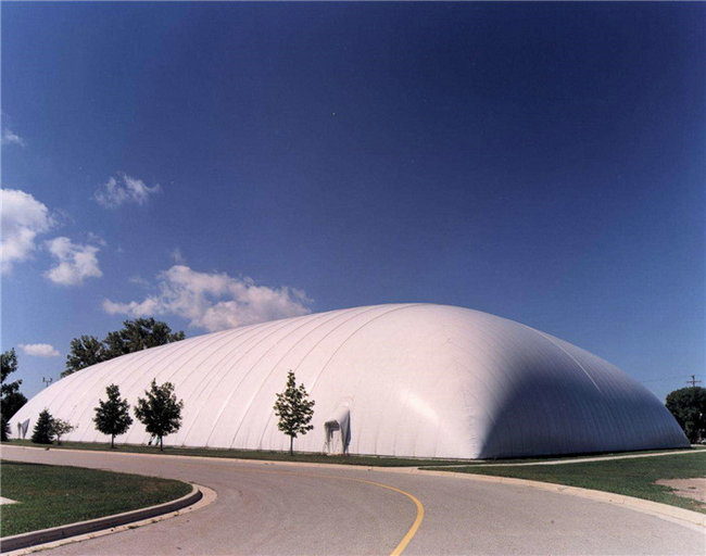 充氣膜結(jié)構(gòu)是指在以高分子材料制成的薄膜制品中充入空氣后而形成房屋的結(jié)構(gòu)。在形式上充氣膜結(jié)構(gòu)與傳統(tǒng)建筑大有不同,又可分為氣承式膜結(jié)構(gòu)和氣脹式膜結(jié)構(gòu)(或叫氣肋式膜結(jié)構(gòu))。充氣膜結(jié)構(gòu)有單層、雙層、氣肋式三種形式,充氣膜結(jié)構(gòu)一般需要長期不間斷地能源供應(yīng)。低拱、大跨建筑中的單層充氣膜結(jié)構(gòu)必須是封閉的空間,并保特一定的室內(nèi)外氣壓差。