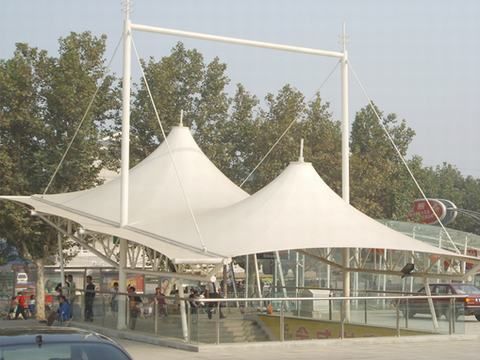 停車入口用膜結構采用環保杜特龍面料縫制而成,具有獨特張力結構和微孔設計;采用熱定型處理,不易收縮,不易變形,篷布大大阻擋紫外線,高強度,高透氣性,通過空氣的自由流通,營造涼爽、透氣的環境,防紫外線,防霉防蛀,便于清潔。