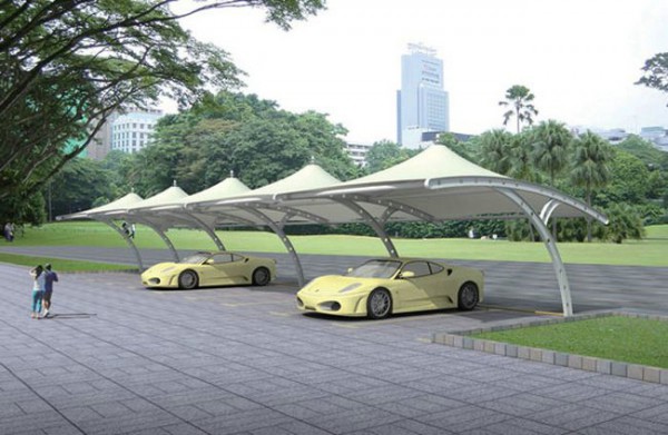膜結構停車棚以一種類似帳篷、充滿柔性的建筑越來越多地出現在城市廣場、公園邊上,以其優美的曲線吸引了大眾的目光,其造型自由輕巧、阻燃、制作簡易、安裝便捷、節能、易于使用。作為一種特殊的現代建筑結構,以高強度柔韌性薄膜材料與張拉體系相結合,形成的具有一定剛度的空間結構體。